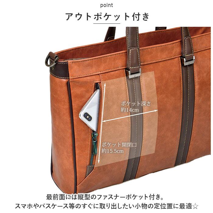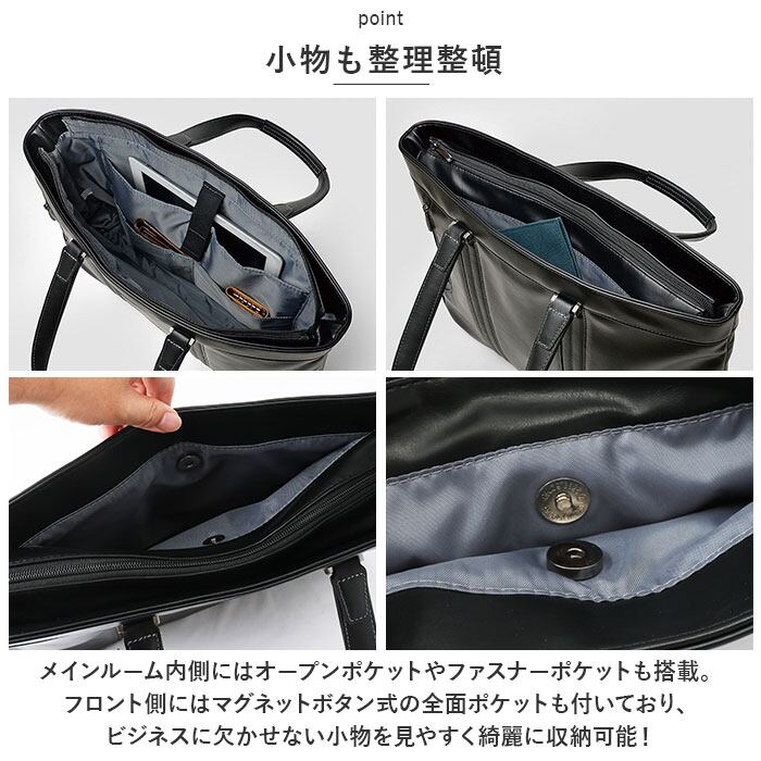 ・メインルーム内側にはオープンポケットやファスナーポケットも搭載。フロント側にはマグネットボタン式の全面ポケットも付いており、スケジュール帳や眼鏡ケースなどビジネスに欠かせない小物を見やすく綺麗に収納可能!
