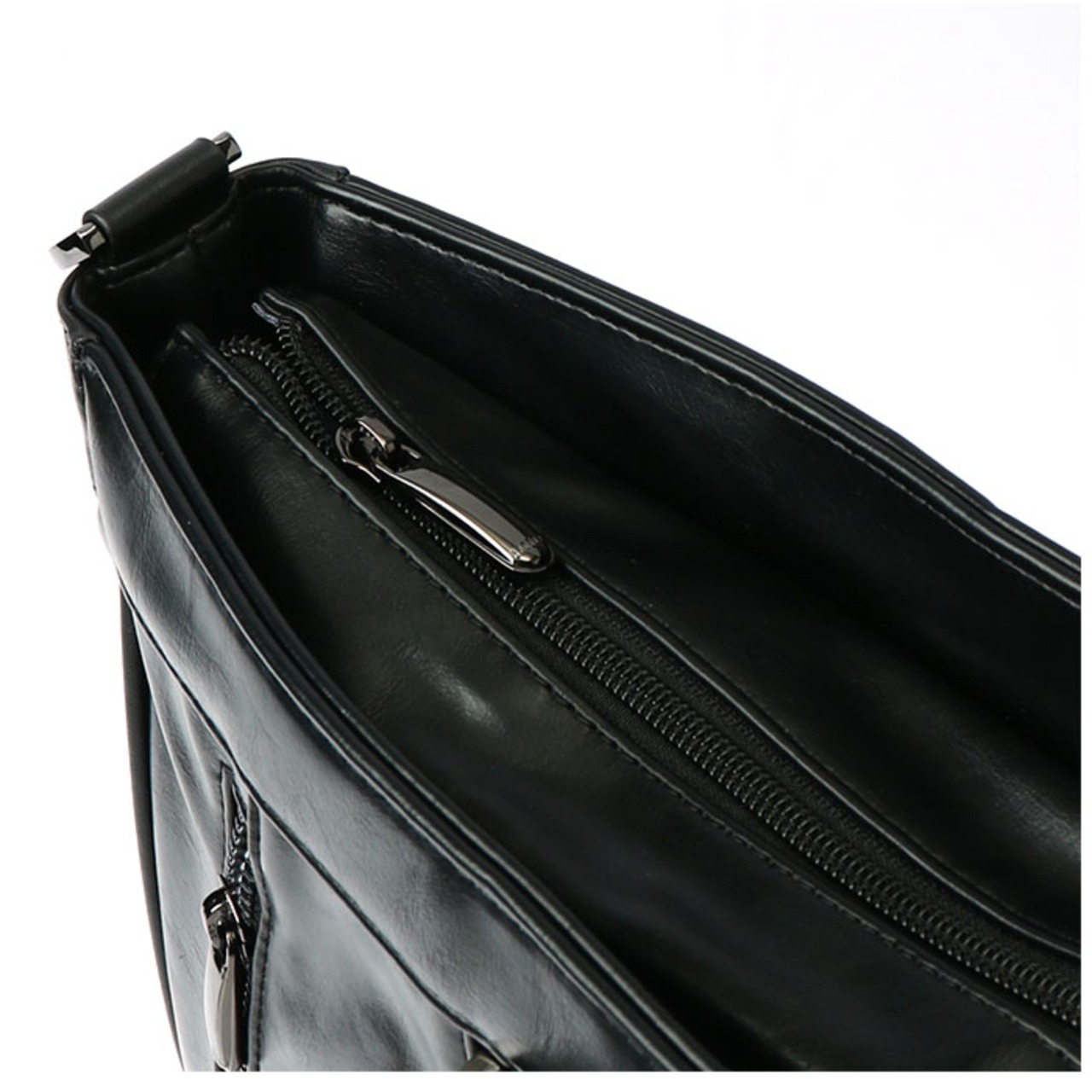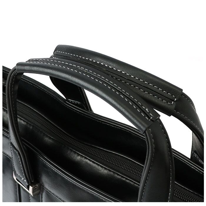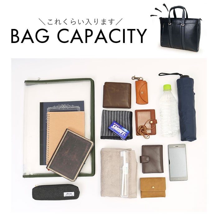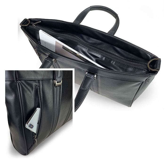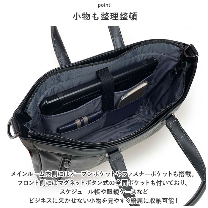 ・メインルーム内側にはオープンポケットやファスナーポケットも搭載。フロント側にはマグネットボタン式の全面ポケットも付いており、スケジュール帳や眼鏡ケースなどビジネスに欠かせない小物を見やすく綺麗に収納可能!