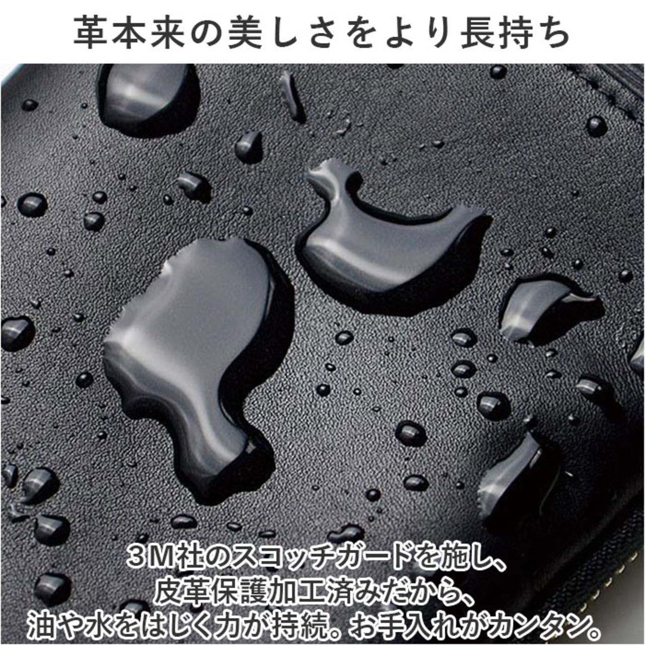 3M社のスコッチガードを施し、皮革保護加工済みだから、油や水をはじく力が持続。お手入れがカンタン。