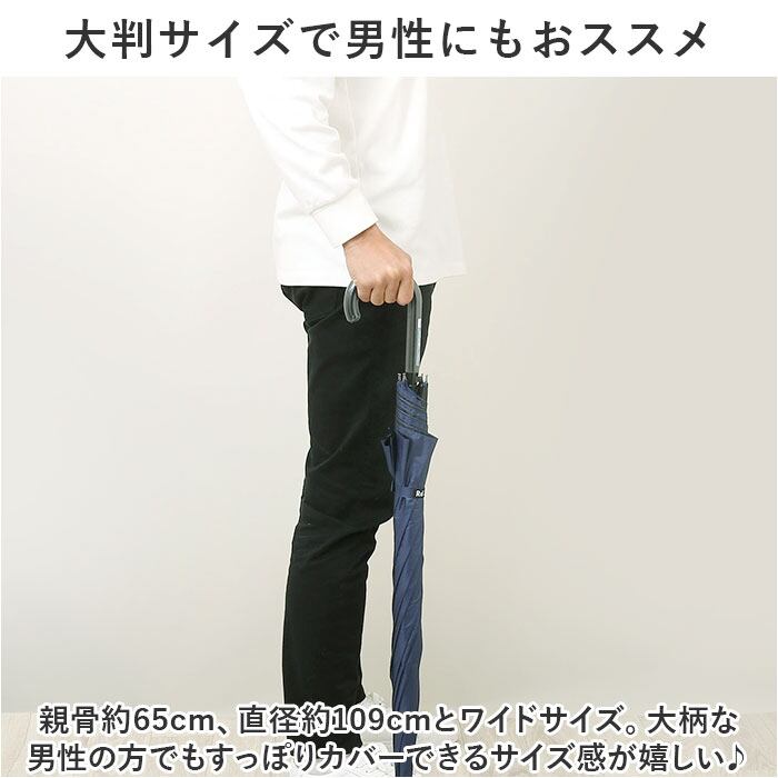 ・親骨約65cm、直径約109cmとワイドサイズ。大柄な男性の方でもすっぽりカバーできるサイズ感が嬉しい♪