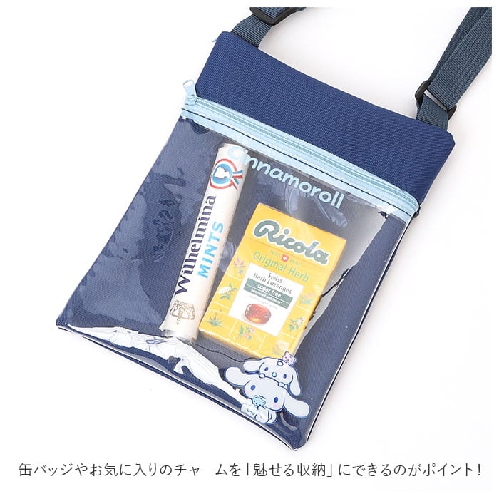 ・ファスナーで開く正面のクリアポケットは、缶バッジやお気に入りのチャームを「魅せる収納」にできるのがポイント!