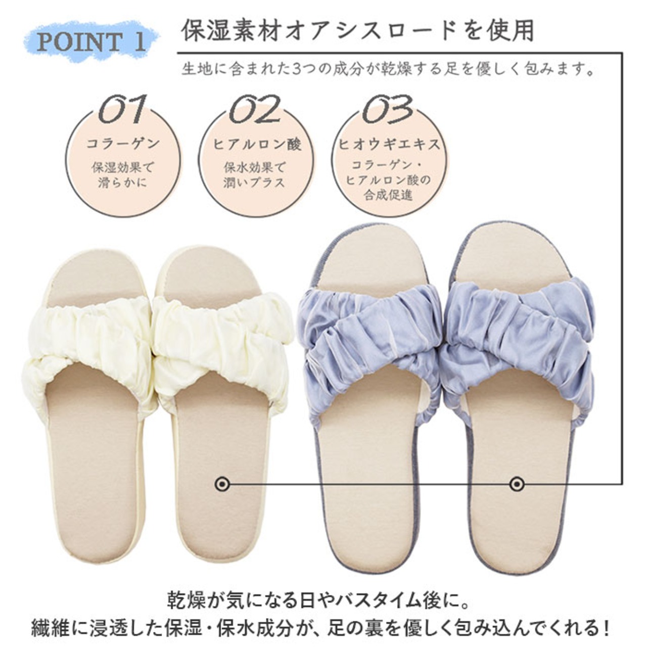 ・乾燥が気になる日やバスタイム後に。繊維に浸透した保湿・保水成分が、足の裏を優しく包み込んでくれる!