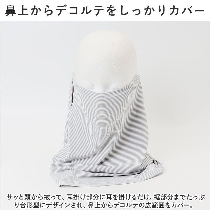 ・サッと頭から被って、耳掛け部分に耳を掛けるだけ。裾部分までたっぷり台形型にデザインされ、鼻上からデコルテの広範囲をカバー。