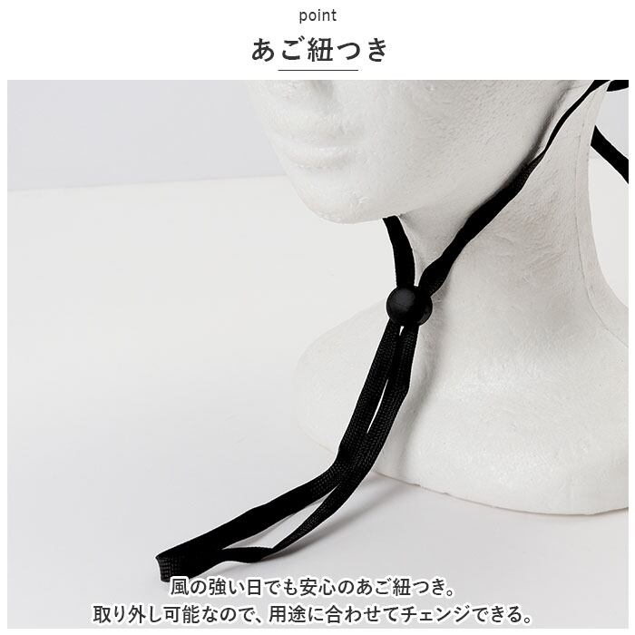 ・自転車走行時や、風の強い日でも安心のあご紐つき。取り外し可能なので、用途に合わせてチェンジできる。