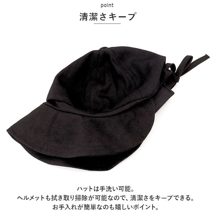 ・ハットは手洗い可能。ヘルメットも拭き取り掃除が可能なので、清潔さをキープできる。お手入れが簡単なのも嬉しいポイント。