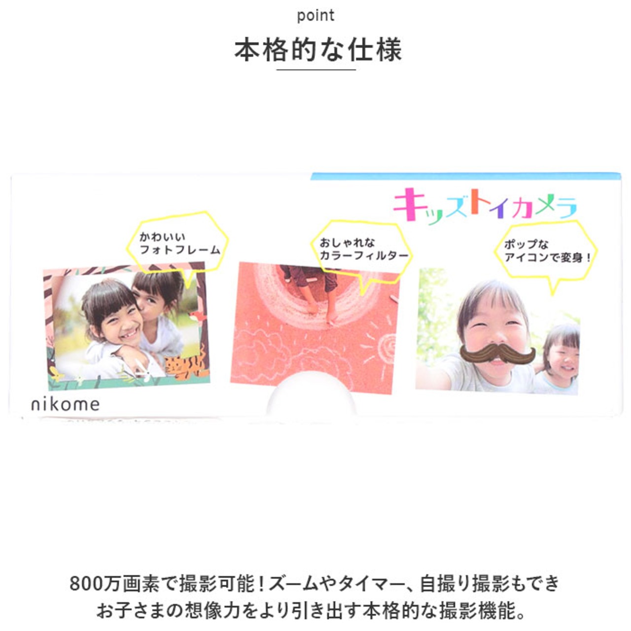 800万画素で撮影可能!ズームやタイマー、自撮り撮影もできお子さまの想像力をより引き出す本格的な撮影機能。