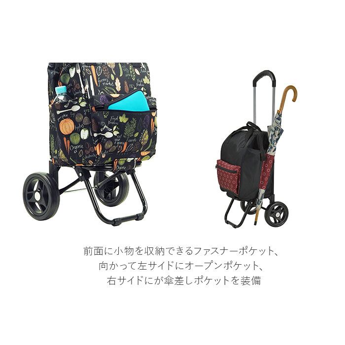 ・前面に小物を収納できるファスナーポケット、向かって左サイドにオープンポケット、右サイドにが傘差しポケットを装備。