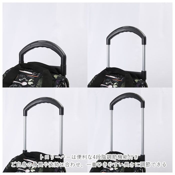 ・トロリーバーは便利な4段階調節機能付き。ご自身の身長や姿勢に合わせ、一番ひきやすい長さに調節できる!