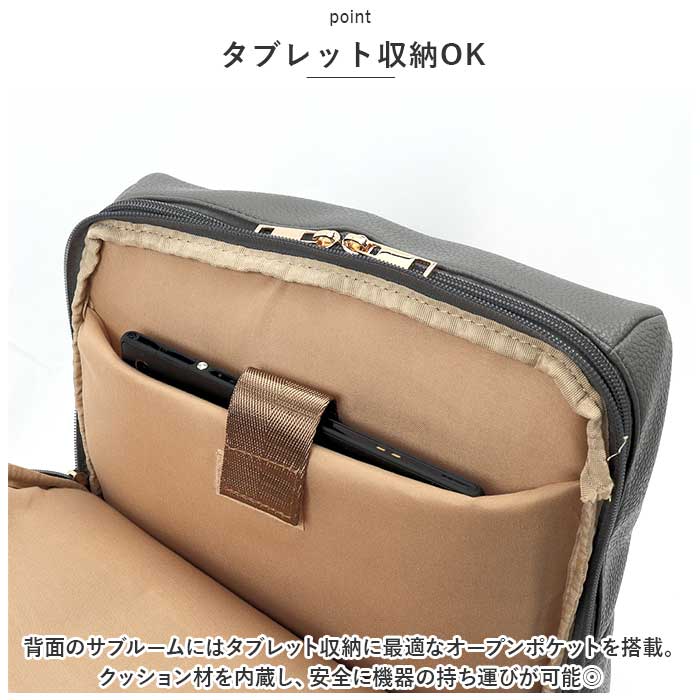 ・背面のサブルームにはタブレット収納に最適なオープンポケットを搭載。クッション材を内蔵し、安全に機器の持ち運びが可能◎