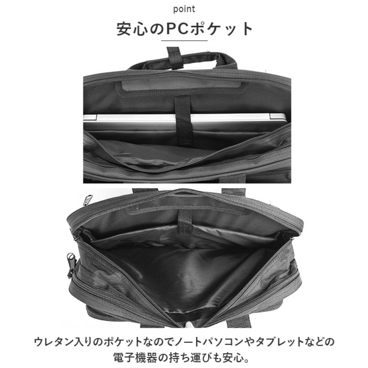 ・ウレタン入りのポケットなのでノートパソコンやタブレットなどの電子機器の持ち運びも安心。