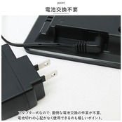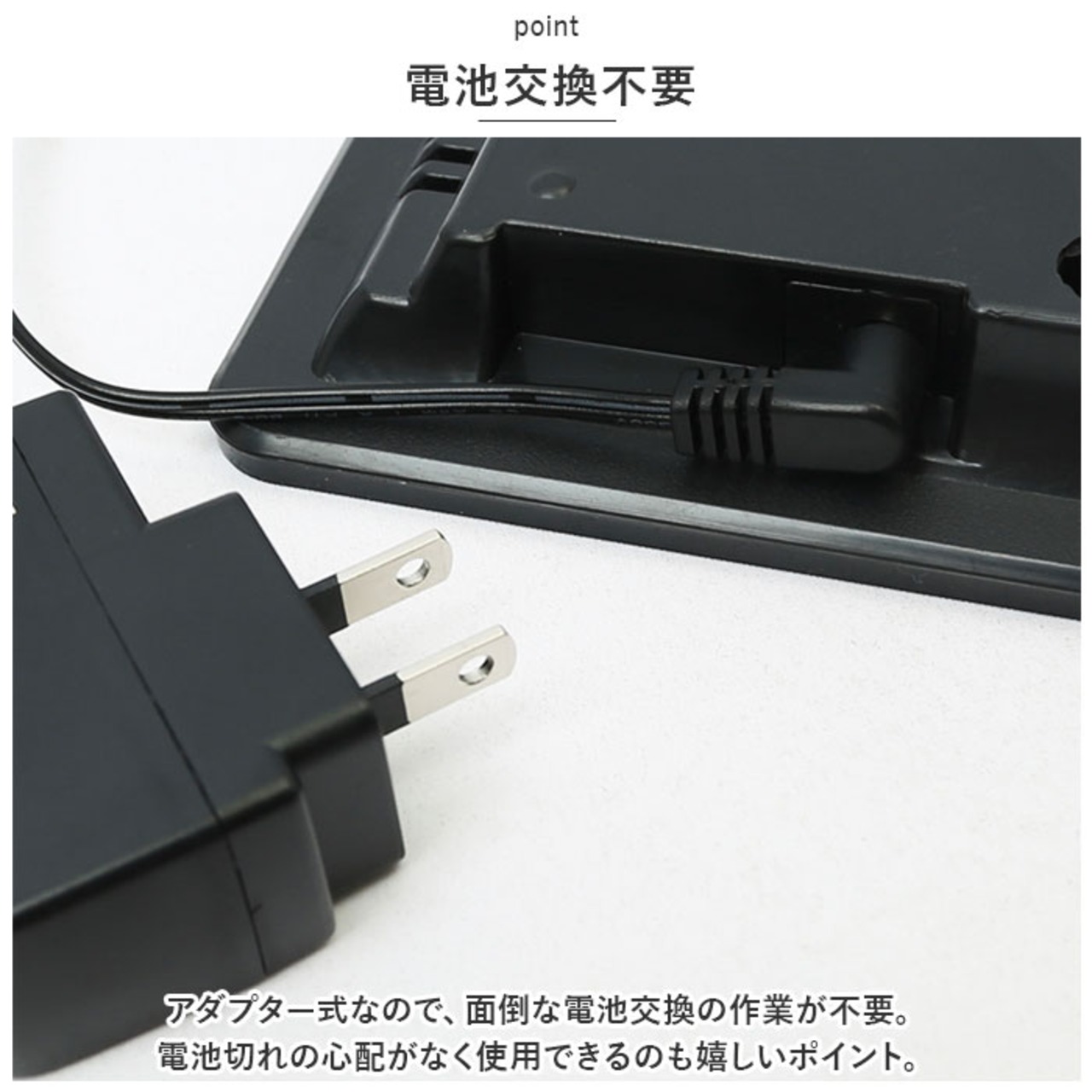 ・アダプター式なので、面倒な電池交換の作業が不要。電池切れの心配がなく使用できるのも嬉しいポイント。