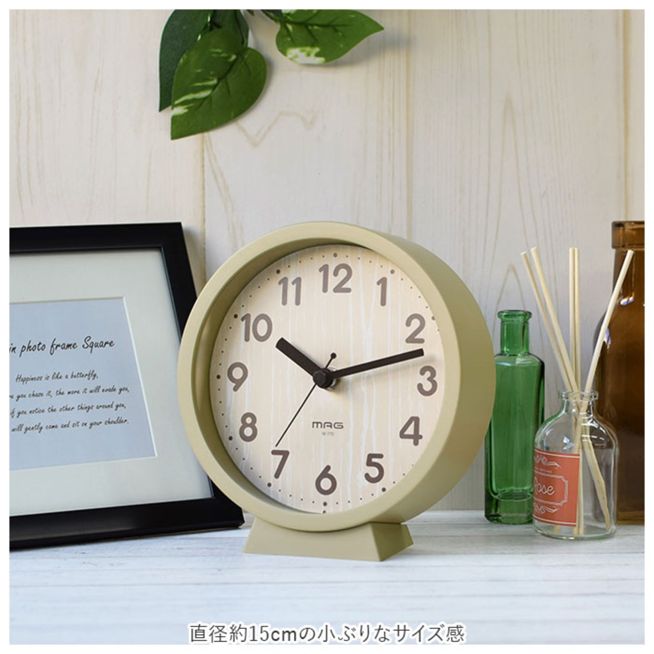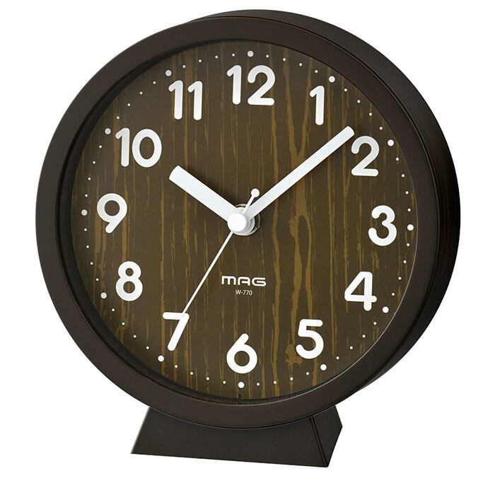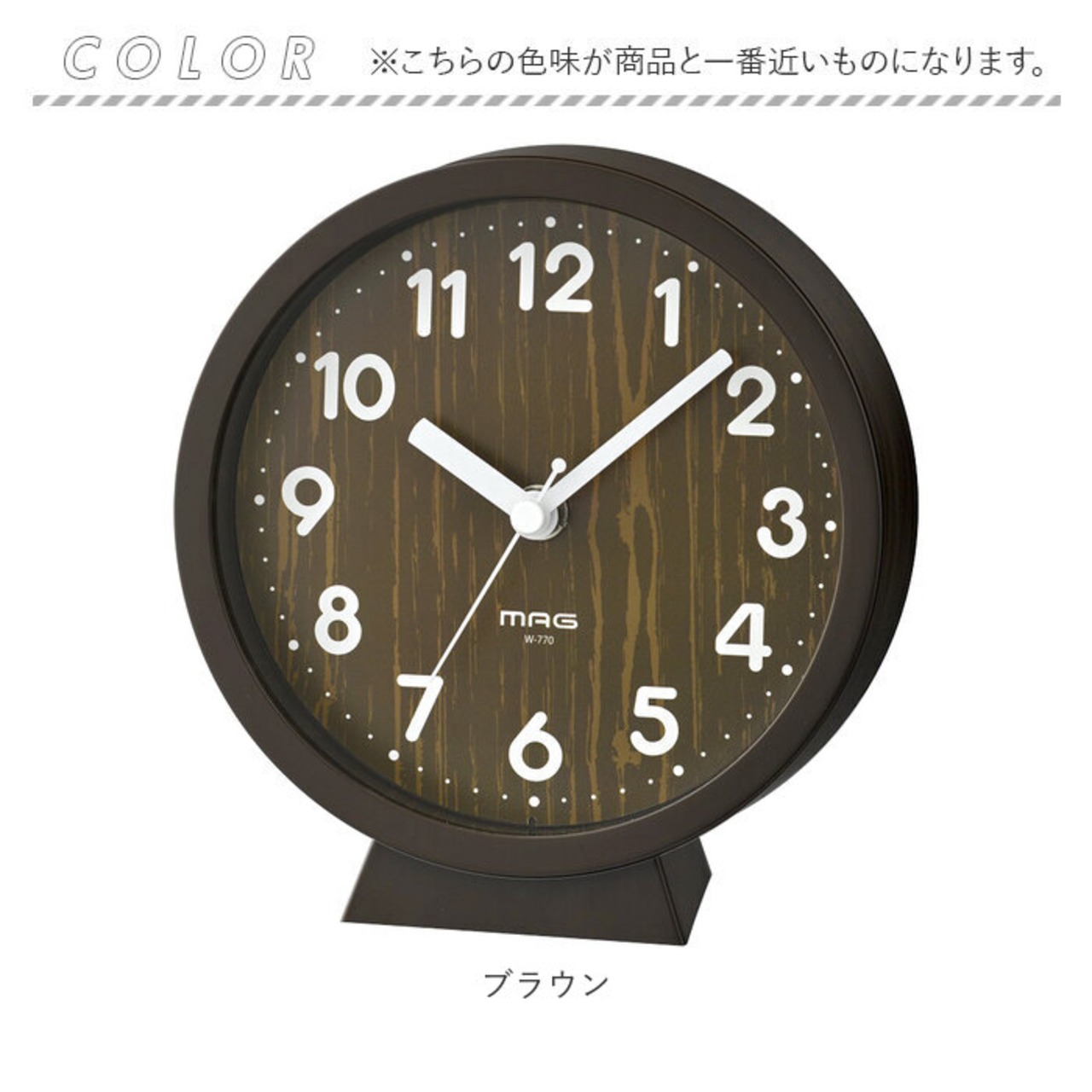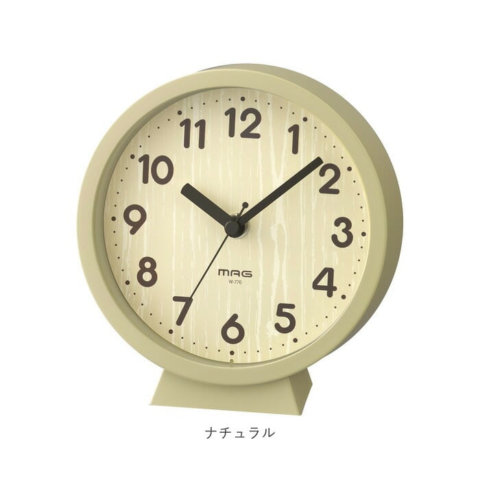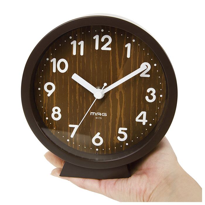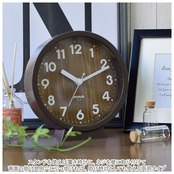 ・木目調デザインの文字盤に丸みのある数字を配置。優しい雰囲気に仕上げた時計。