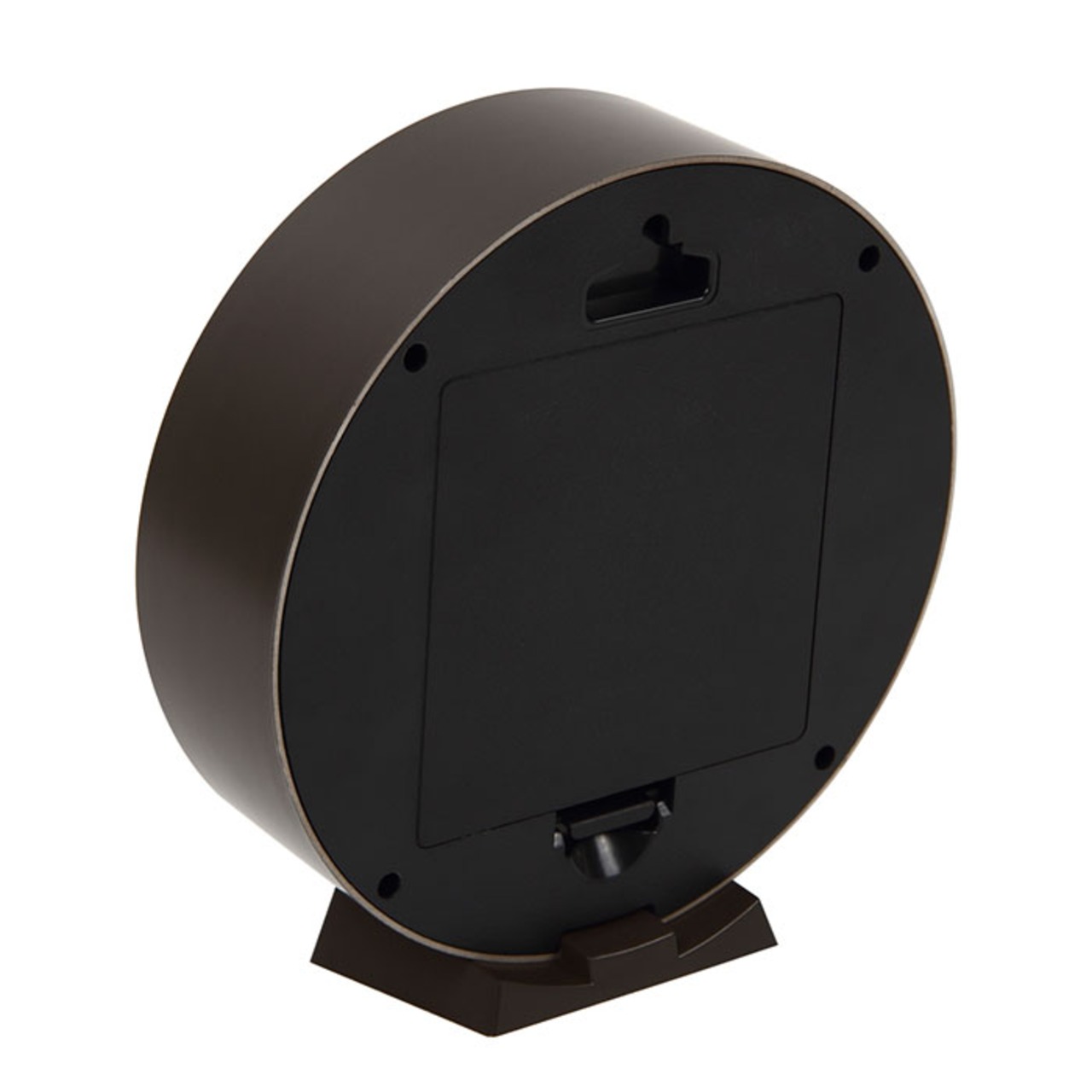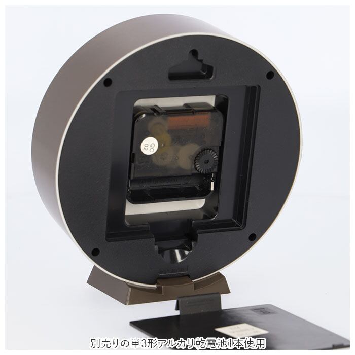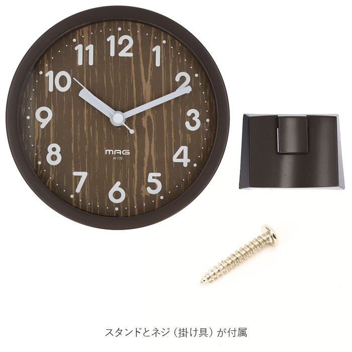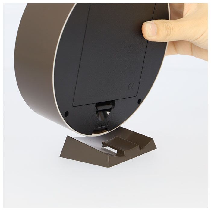 ・スタンドとネジ(掛け具)が付属。スタンドを使えば置き時計に、ネジを壁に取り付けて背面の掛け具用穴に引っ掛ければ、掛け時計としても使える両用タイプ。