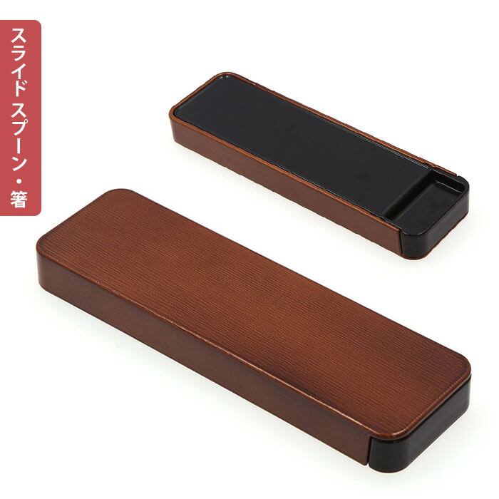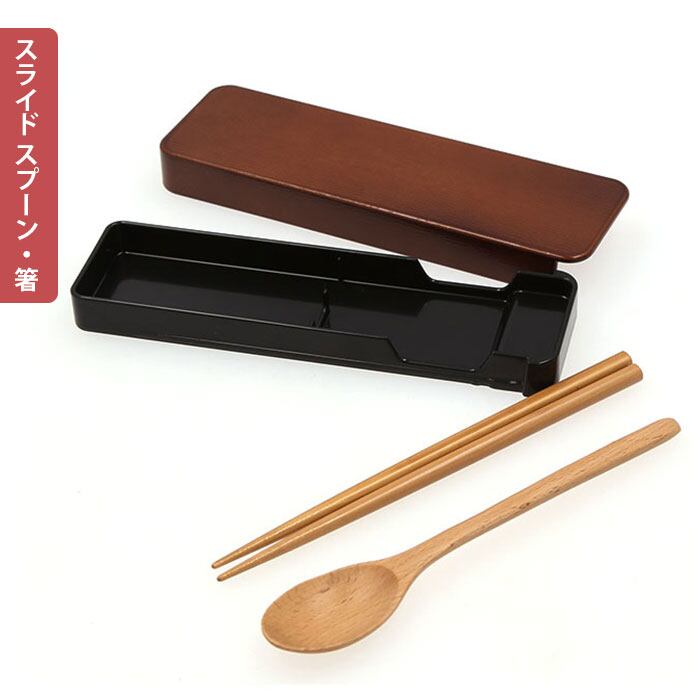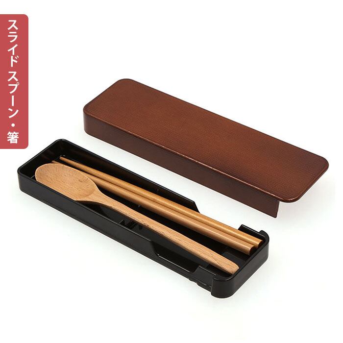 ・木の温もりが優しいカトラリーに、木目調ケースを合わせた「木目スライド スプーン&お箸セット(18cm)」。