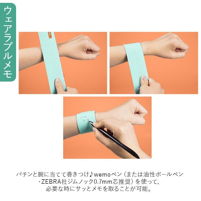 ・パチンと腕に当てて巻きつけ♪wemoペン(または油性ボールペン・ZEBRA社ジムノック0.7mm芯推奨)を使って、必要な時にサッとメモを取ることが可能。