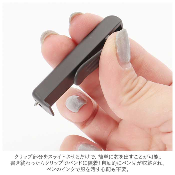 ・書き終わったらクリップでバンドに装着!自動的にペン先が収納され、ペンのインクで服を汚す心配も不要。
