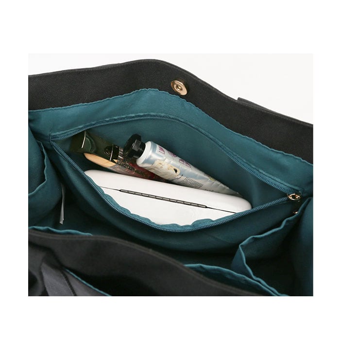 ・メインルーム内側には、小物収納に便利なオープンポケットX3、500mlペットボトルや折り畳み傘の収納に便利なホルダーX1、貴重品やマスク収納に役立つファスナーポケットX1を配置し、散らかる荷物をすっきり収納♪