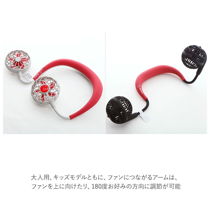 ・大人用、キッズモデルともに、ファンにつながるアームは、ファンを上に向けたリ、180度お好みの方向に調節が可能。