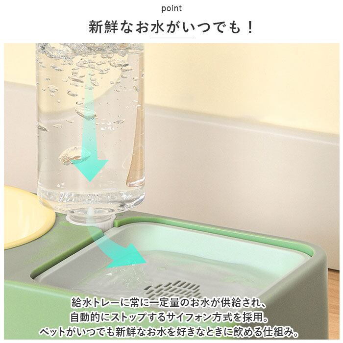 ・給水トレーに常に一定量のお水が供給され、自動的にストップするサイフォン方式を採用。ペットがいつでも新鮮なお水を好きなときに飲める仕組み。