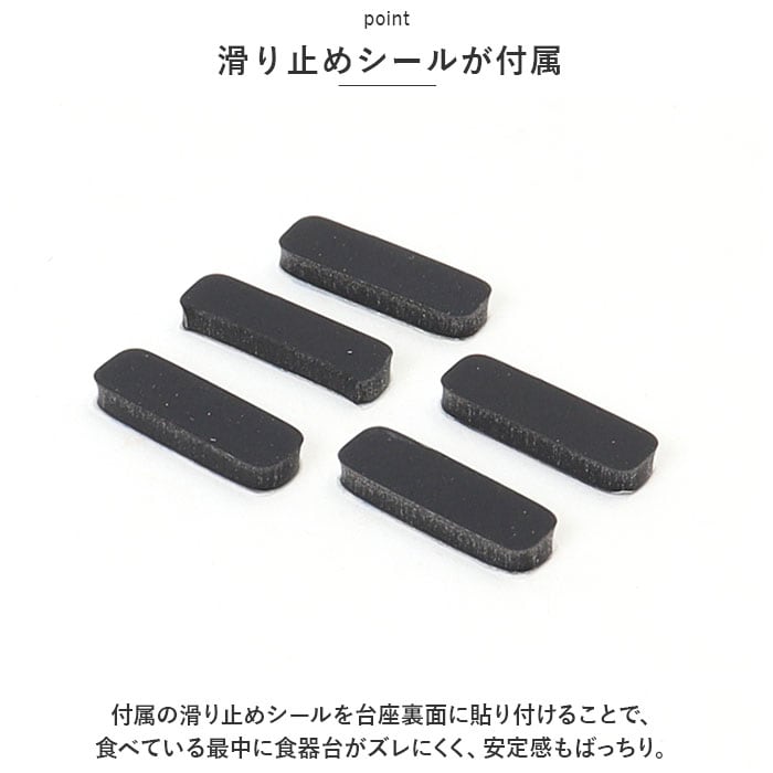 ・付属の滑り止めシールを台座裏面に貼り付けることで、食べている最中に食器台がズレにくく、安定感もばっちり。