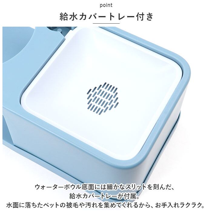 ・ウォーターボウル底面には細かなスリットを刻んだ、給水カバートレーが付属。水面に落ちたペットの被毛や汚れを集めてくれるから、お手入れラクラク。