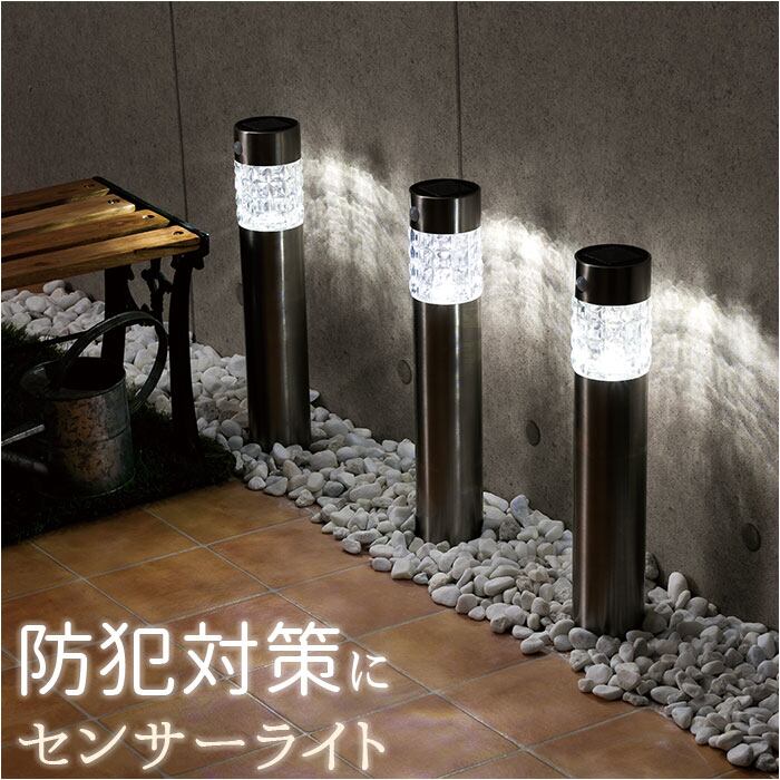 ・暗くなると立体的なクリア面が、ガーデンマーカーとして点灯。感知センサーが反応すると、より明るく点灯し、約20秒で通常時の明るさに戻る仕組み。
