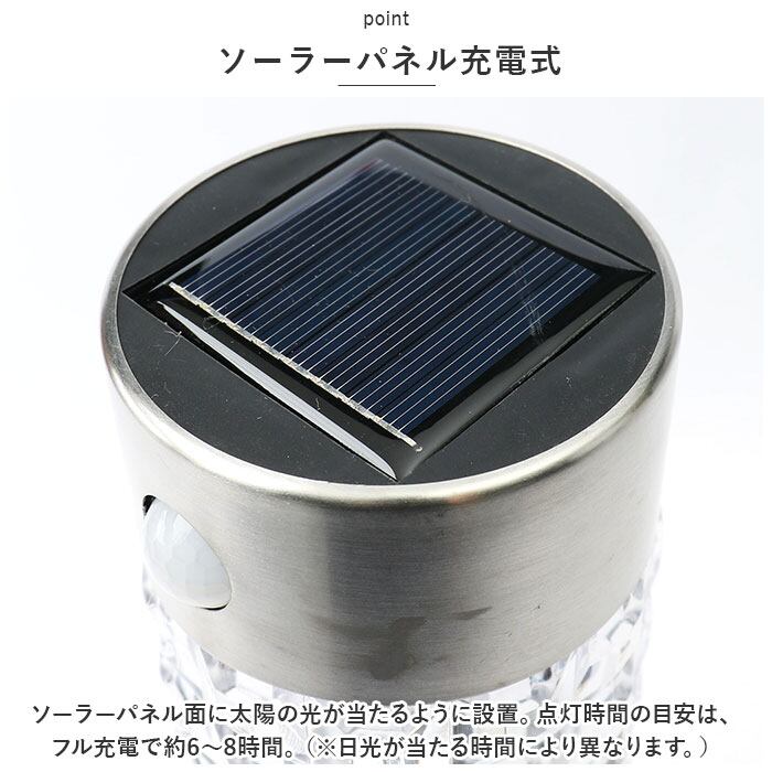 ・ソーラーパネル面に太陽の光が当たるように設置。点灯時間の目安は、フル充電で約6~8時間。(※日光が当たる時間により異なります。)