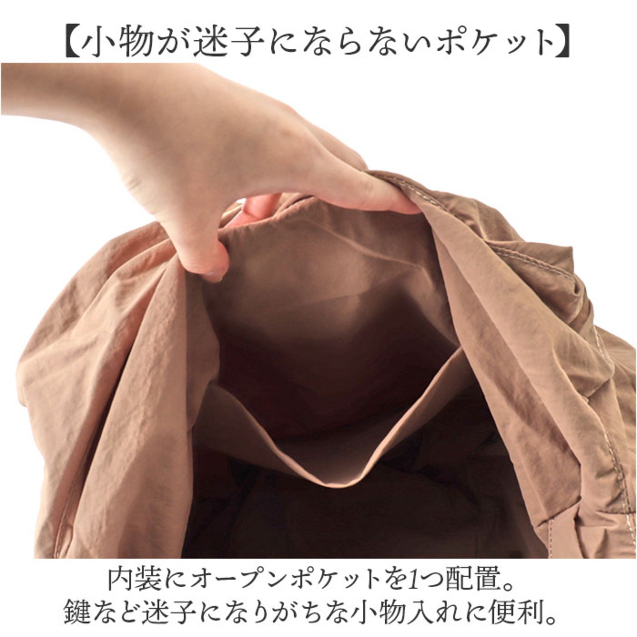 ・内装にオープンポケットを1つ配置。鍵など迷子になりがちな小物入れに便利。