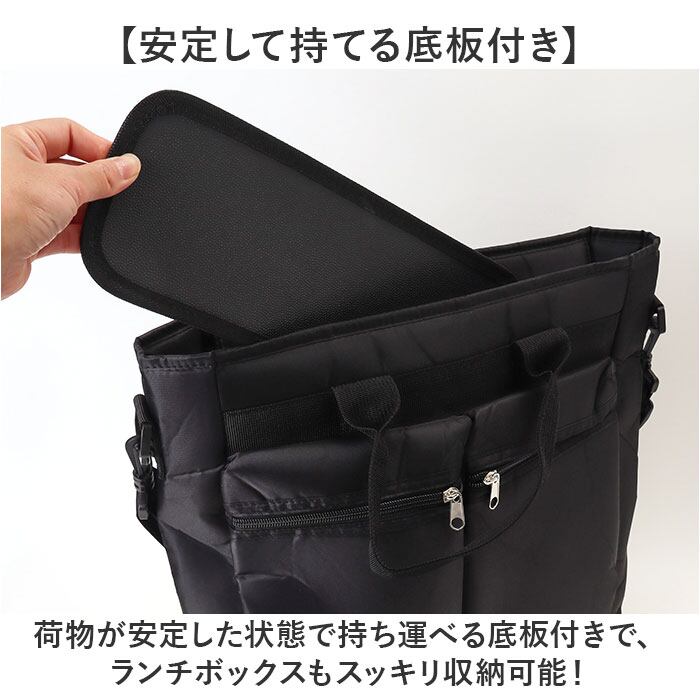 ・荷物が安定した状態で持ち運べる底板付きで、ランチボックスもスッキリ収納可能!