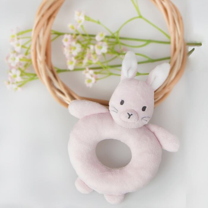 「リングラトル」は、にぎる・ふる・聴くといったシンプルな動きのなかで、赤ちゃんの五感と好奇心をやさしく育てるおもちゃ。やわらかい布素材と握りやすいドーナツ型のデザインは、はじめてのおもちゃに最適。