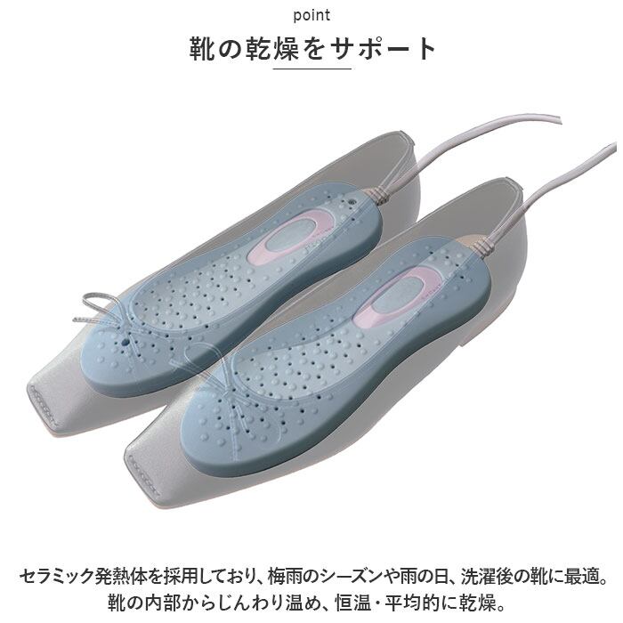 ・セラミック発熱体を採用しており、梅雨のシーズンや雨の日、洗濯後の靴に最適。靴の内部からじんわり温め、恒温・平均的に乾燥。