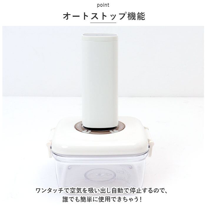 ・別売りのワンタッチ電動真空ポンプをセットして、全自動ボタンをポンと押すだけ。においも汁物も漏らさず、柔らかい食材が潰れる心配もなし!(※電動真空ポンプは当店別ページにて販売中です。商品コード:wj8132)