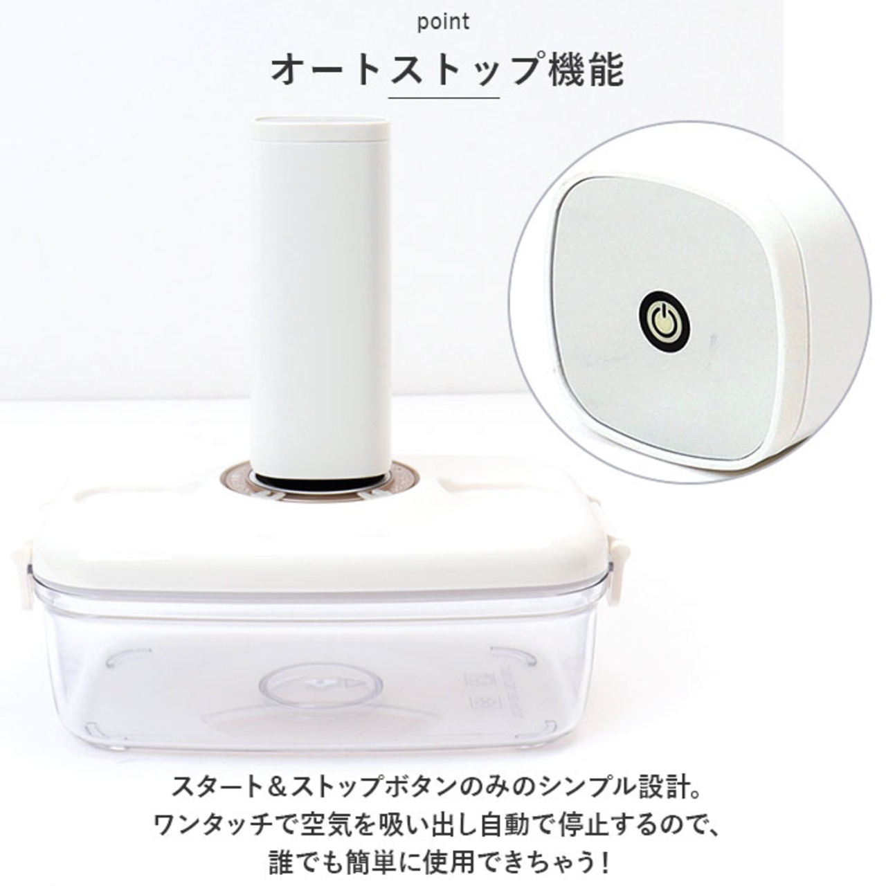 ・スタート&ストップボタンのみのシンプル設計。ワンタッチで空気を吸い出し自動で停止するので、誰でも簡単に使用できちゃう!