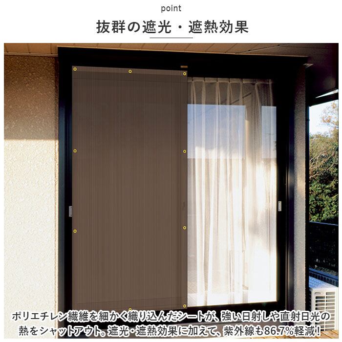 ・ポリエチレン繊維を細かく織り込んだシートが、強い日射しや直射日光の熱をシャットアウト。遮光・遮熱効果に加えて、紫外線も86.7%軽減!
