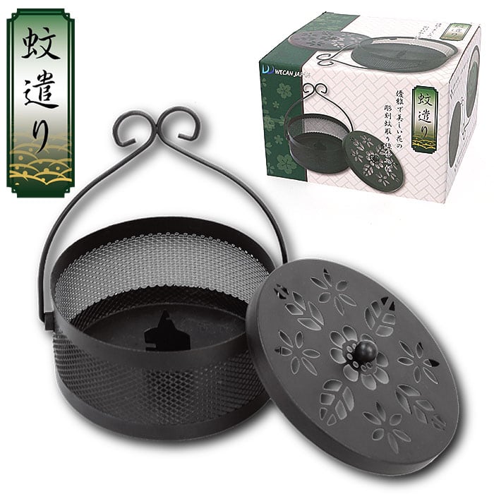 ・和風鉄器のようなざらついたスチール素材表面に、優雅な花びらや葉の紋様の型抜きを施したレトロで存在感のある蚊取り線香ホルダー。