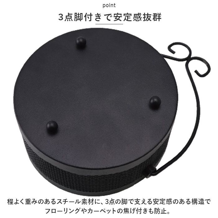 ・程よく重みのあるスチール素材に、3点の脚で支える安定感のある構造で、フローリングやカーペットの焦げ付きも防止。