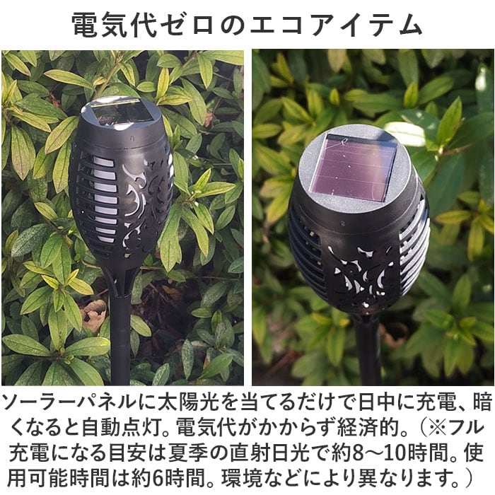 ・ソーラーパネルに太陽光を当てるだけで日中に充電、暗くなると自動点灯。電気代がかからず経済的。(※フル充電になる目安は夏季の直射日光で約8~10時間。使用可能時間は約6時間。環境などにより異なります。)