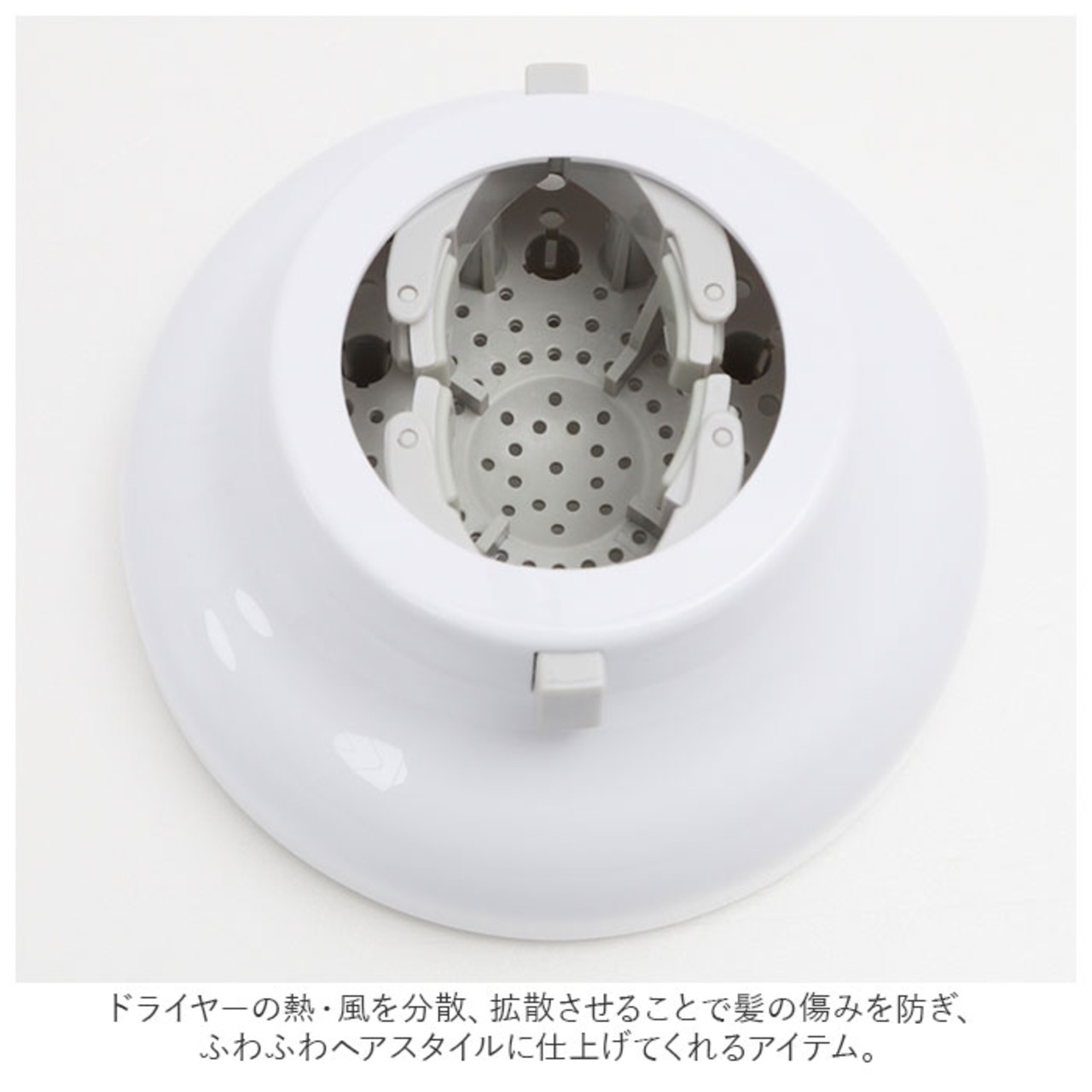 ・ドライヤーの熱・風を分散、拡散させることで髪の傷みを防ぎ、ふわふわヘアスタイルに仕上げてくれるアイテム。