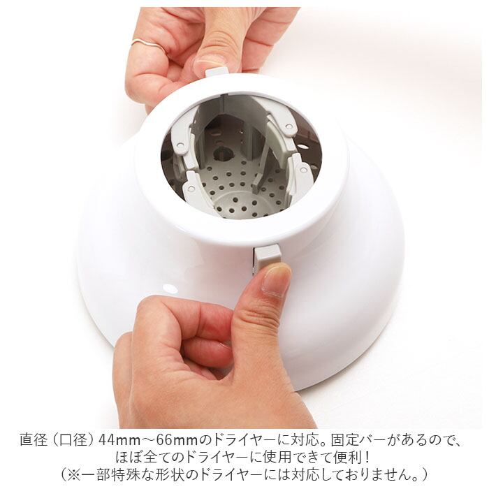 ・直径(口径)44mm-66mmのドライヤーに対応。固定バーがあるので、ほぼ全てのドライヤーに使用できて便利!(※一部特殊な形状のドライヤーには対応しておりません。)