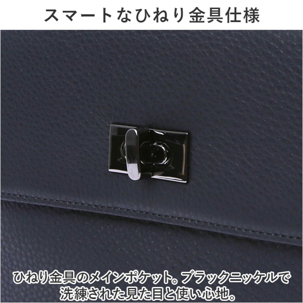 【スマートなひねり金具仕様】ひねり金具のメインポケット。ブラックニッケルで洗練された見た目と使い心地。