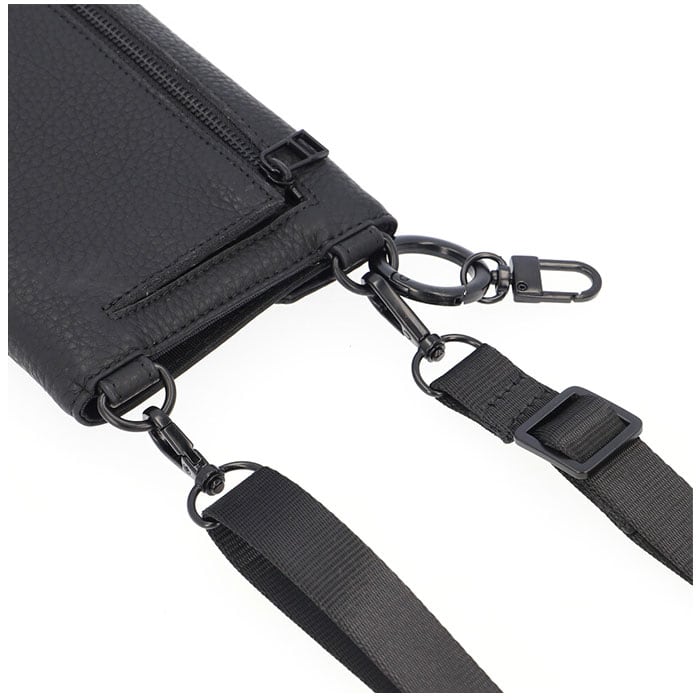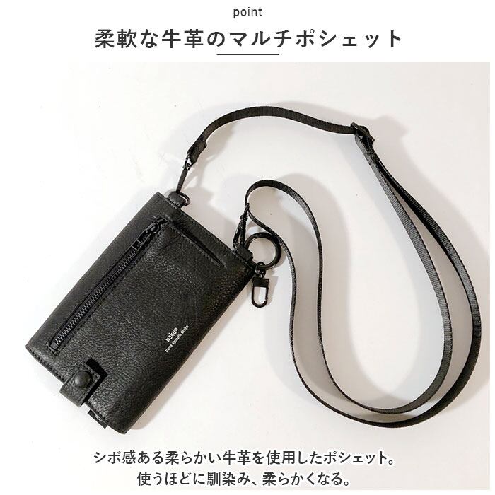 ・内装にスマホ収納ポケット、外装に小銭入れ・落下防止ベロ。取り外し可能なリングで鍵も携帯可能。