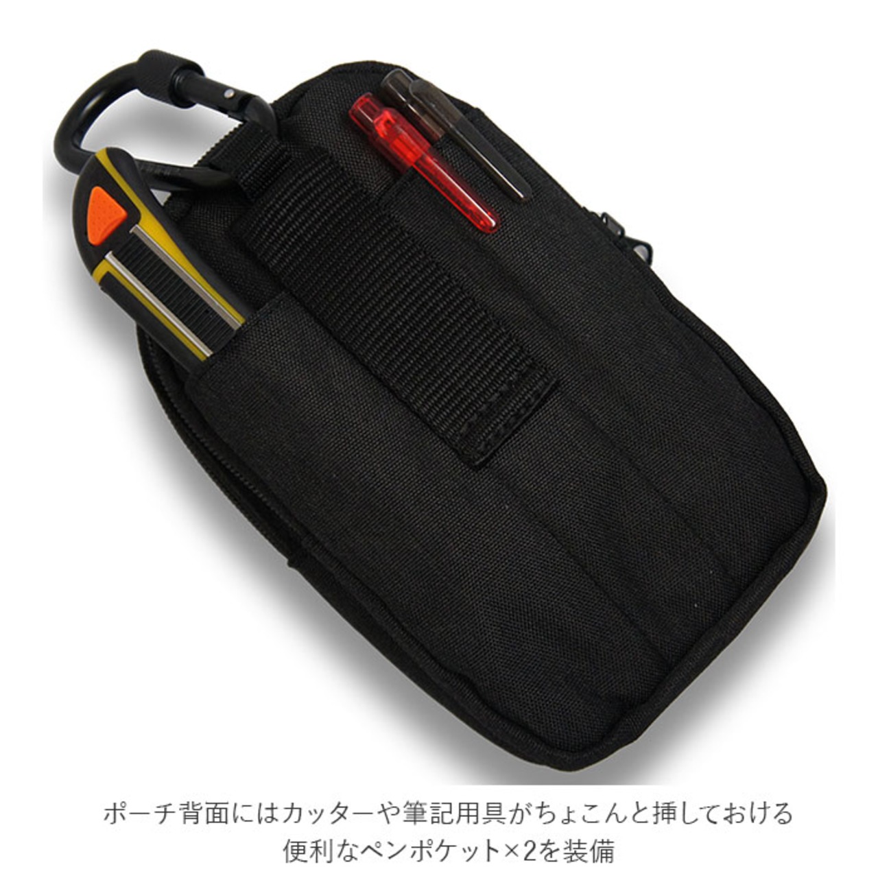・ポーチ背面にはカッターや筆記用具がちょこんと挿しておける便利なペンポケット×2を装備。