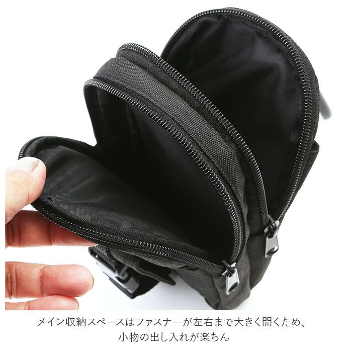 ・メイン収納スペースはファスナーが左右まで大きく開くため、小物の出し入れが楽ちん。スマホはもちろん、モバイルバッテリーや文具まで、様々なツールを収納可能。