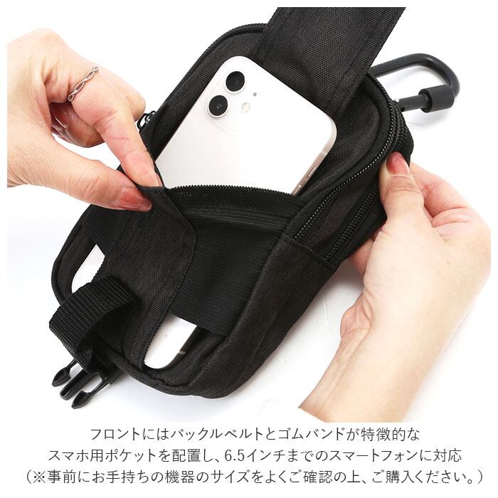 ・フロントにはバックルベルトとゴムバンドが特徴的なスマホ用ポケットを配置し、6.5インチまでのスマートフォンに対応した大きめのつくり。(※事前にお手持ちの機器のサイズをよくご確認の上、ご購入ください。)