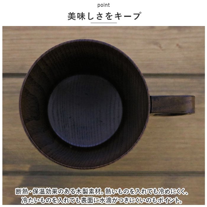 ・断熱・保温効果のある木製素材。熱いものを入れても冷めにくく、冷たいものを入れても表面に水滴がつきにくいのもポイント。