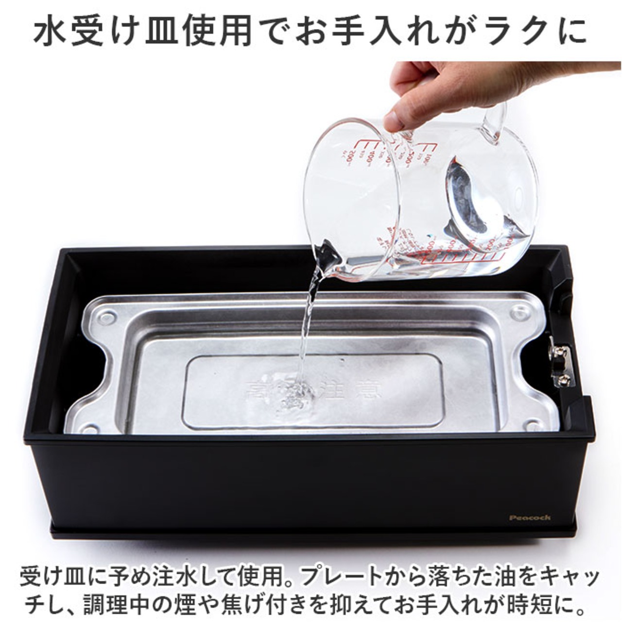 ・受け皿に予め注水して使用。プレートから落ちた油をキャッチし、調理中の煙や焦げ付きを抑えてお手入れが時短に。