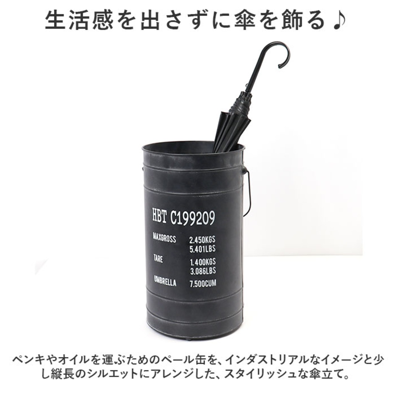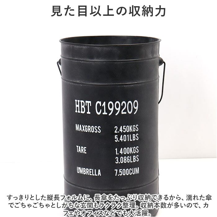 ・ペンキやオイルを運ぶためのペール缶を、インダストリアルなイメージと少し縦長のシルエットにアレンジした、スタイリッシュな傘立て。