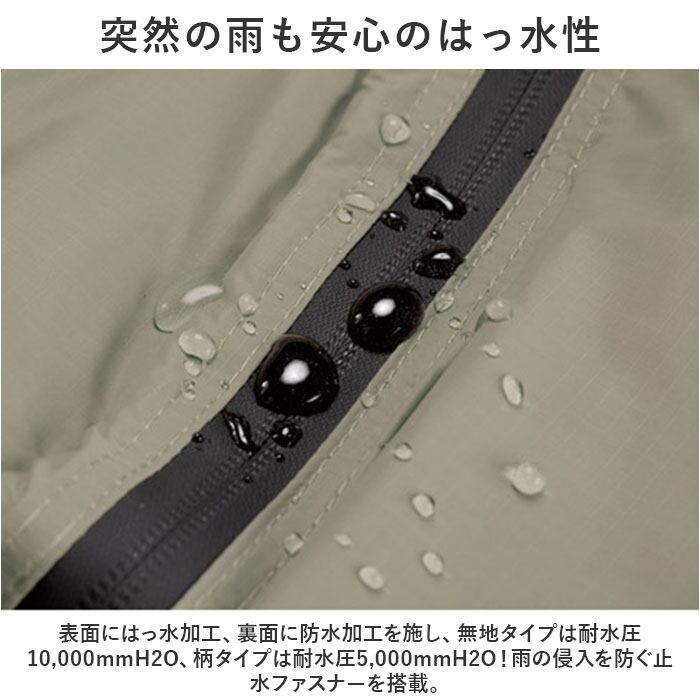 ・表面にはっ水加工、裏面に防水加工を施し、無地タイプは耐水圧10,000mmH2O、柄タイプは耐水圧5,000mmH2O!雨の侵入を防ぐ止水ファスナーを搭載。