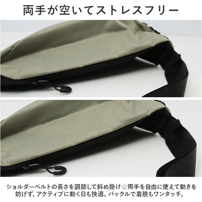 ・ショルダーベルトの長さを調節して斜め掛け☆両手を自由に使えて動きを妨げず、アクティブに動く日も快適。バックルで着脱もワンタッチ。