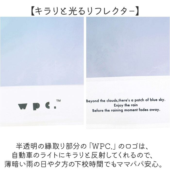 ・半透明の縁取り部分の「WPC.」のロゴは、自動車のライトにキラリと反射してくれるので、薄暗い雨の日や夕方の下校時間でもママパパ安心。